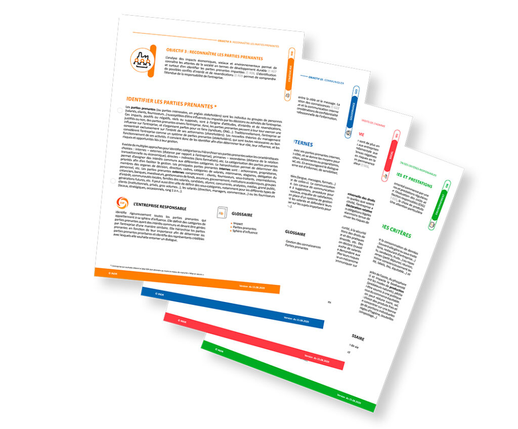 Le Guide ESR est à la base du programme complet d’accompagnement des entreprises ESR – ENTREPRISE RESPONSABLE, promu par l’INDR. Dans ce cadre, il prépare l’entreprise à son auto-évaluation en ligne et, en cas d’intérêt, l’accompagne vers le label ESR – ENTREPRISE RESPONSABLE.